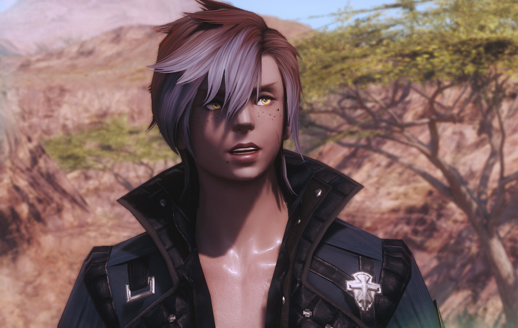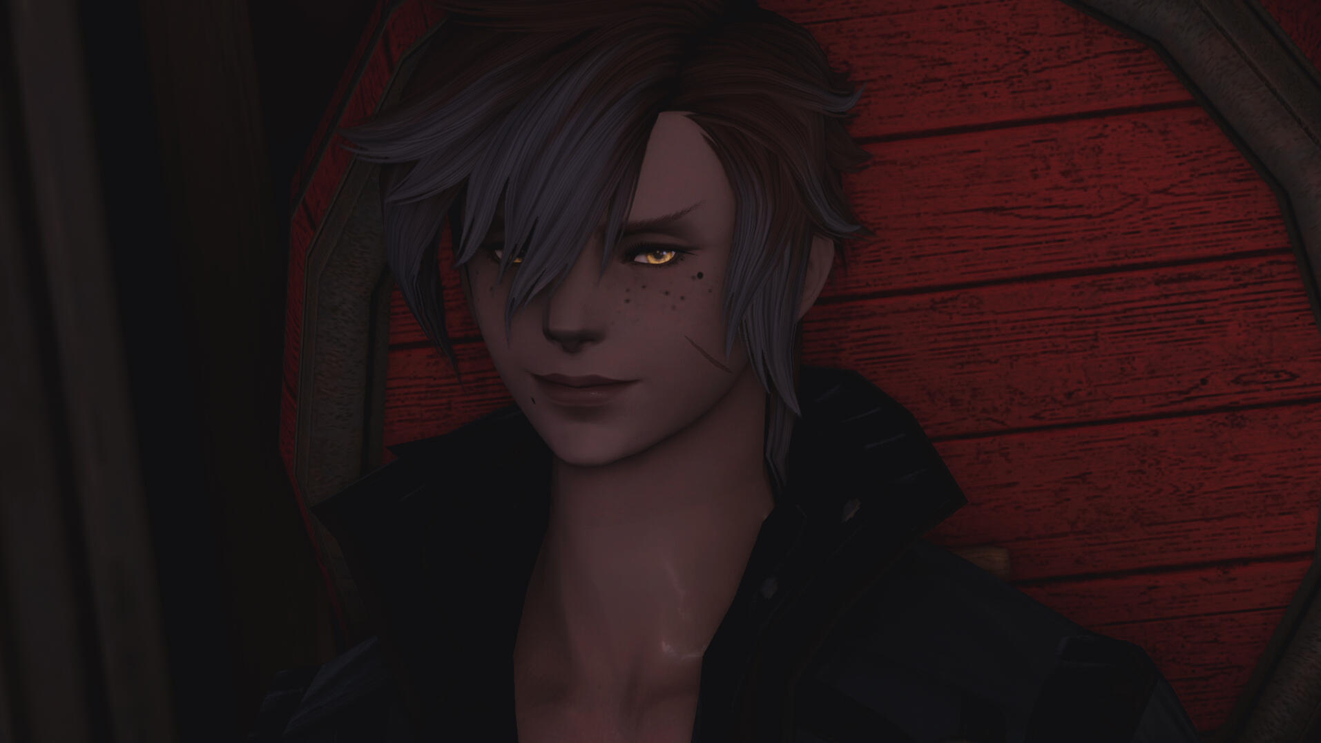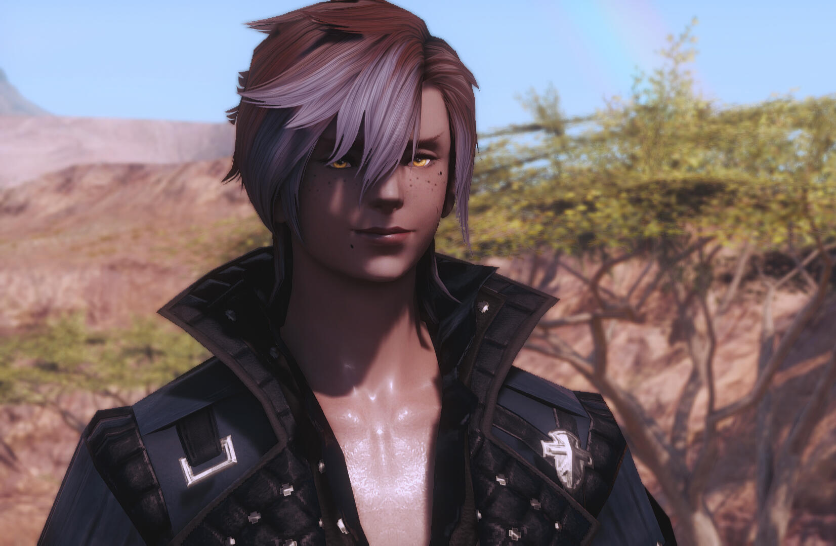 - Soft pink highlights in his hair, same colour as his eyes. His hair is well kept.