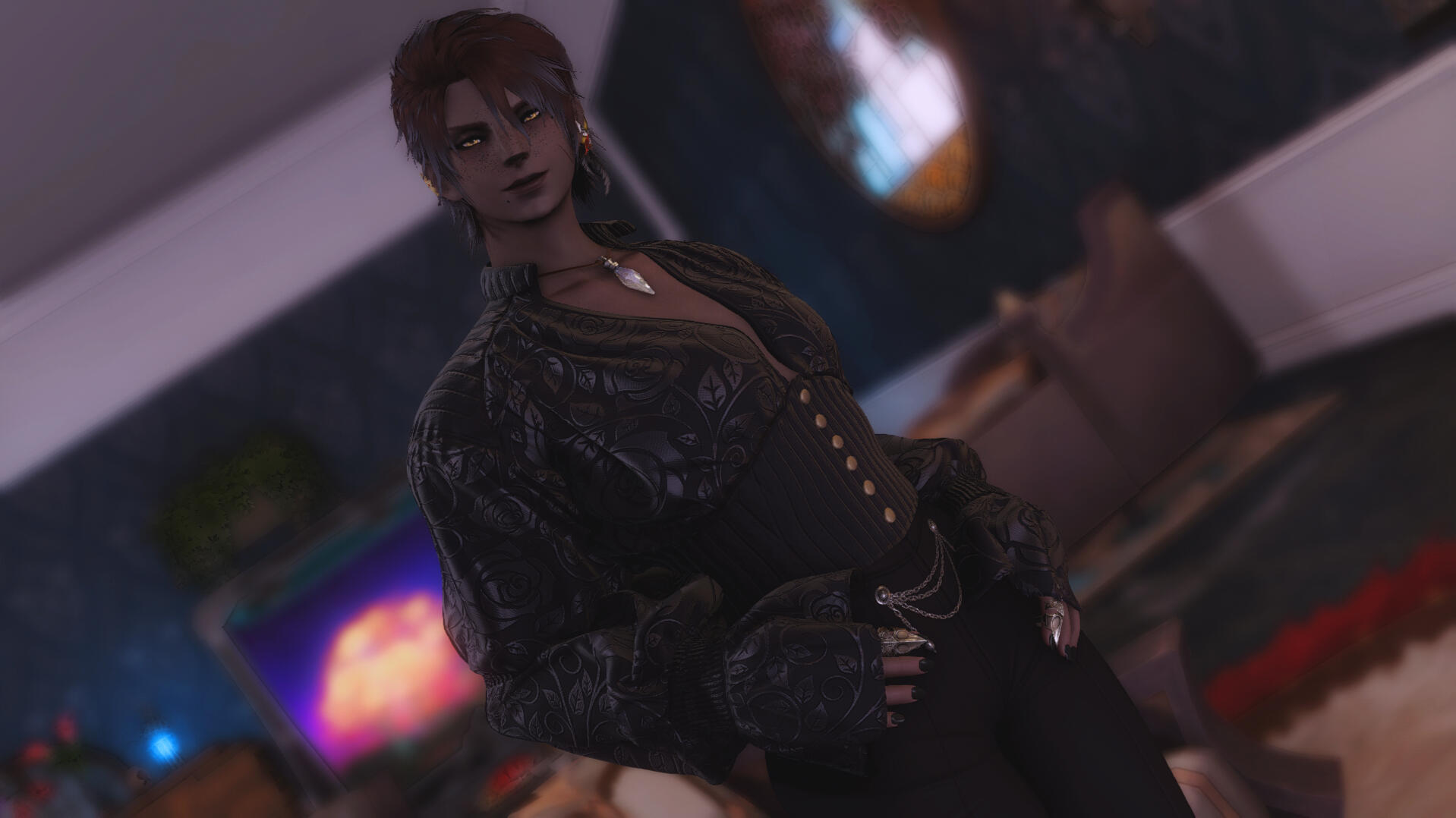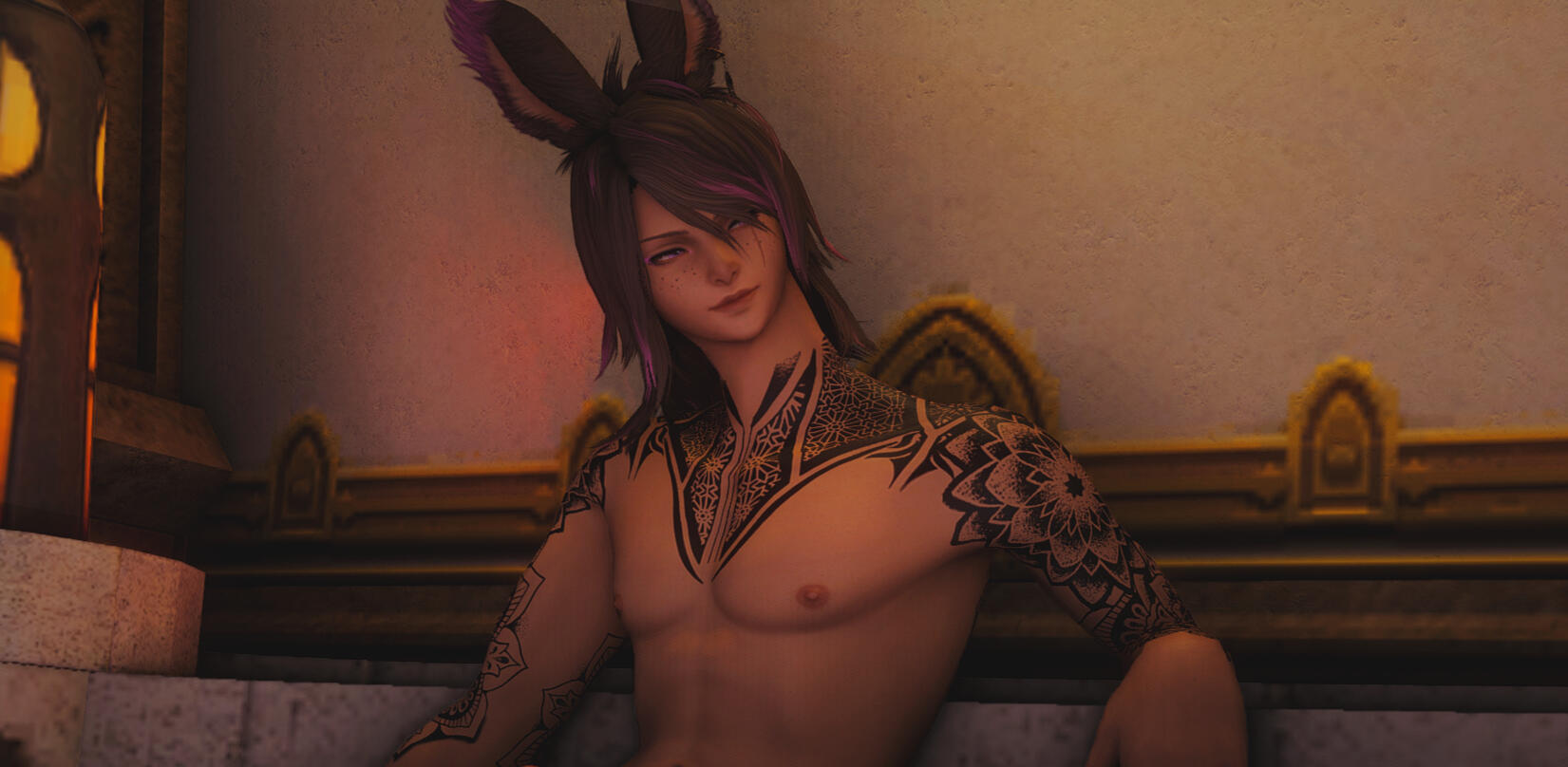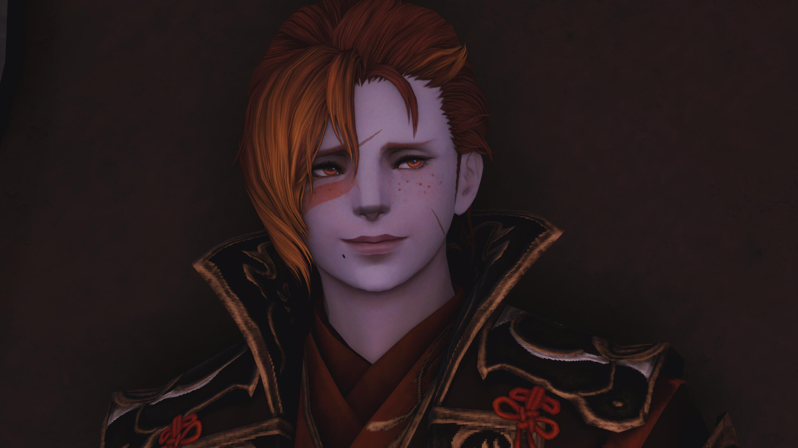 - Soft pink highlights in his hair, same colour as his eyes. His hair is well kept.