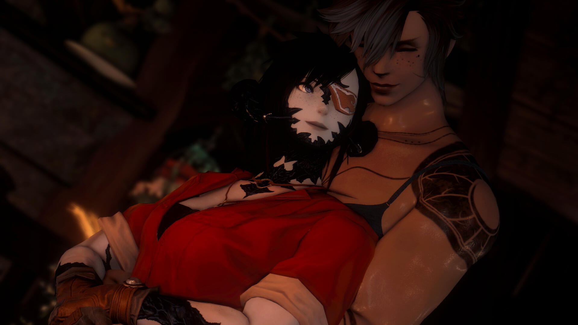 - Tattoos across her body and back. Intricate in it's workings, a wing motif on her back.Gear: